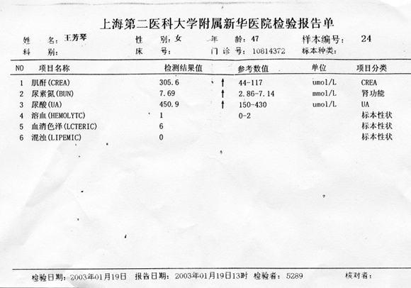 王芳琴治疗前肾功能化验单