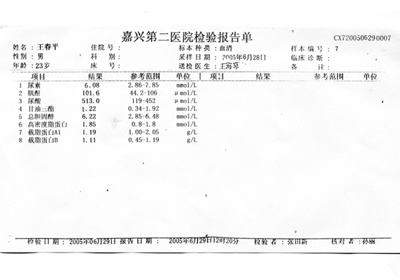 5 王春平 男 23岁,淅江海宁市人, 患者2005于单位体检时尿常规提示:Pro+BLD