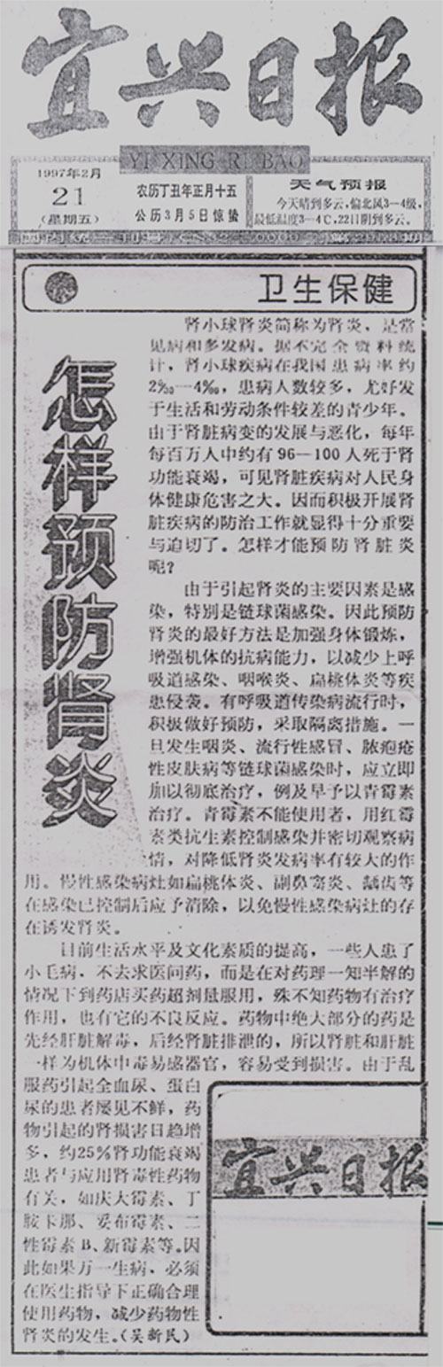 发表于宜兴日报科普文章怎样预防肾炎