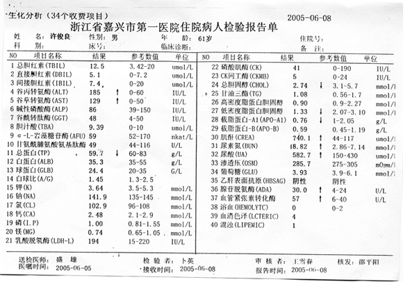 2 许俊良 男 61 岁,淅江嘉兴市人。慢性肾小球肾炎病史12年。感冒后经常出现全身水肿、乏力、腰膝酸软、面色苍黄、夜尿偏多,近期出现全身瘙痒、恶心呕吐等症状,到当地医院做详细检查,肾功能血肌酐740.1umol/L,尿素氮18.82mmol/L。诊断为尿毒症,后经打针输液,口服中药等疗效不佳,当地医生建议血透,其本人及家人都不愿血透,经别的病人介绍来我处就医,一疗程后,各种症状均明显减轻,肾功能各项数值均明显下降,血肌酐274umol/L,尿素氮 14.33mmol/L血色素8.5g,效不更方,由于路途遥远不能前来,采用邮购方式继续用三个疗程。症状消失,感觉如常人,嘱其经常间断服用中药,以巩固疗效,下面是他在治疗前与治疗后的化验收报告。?