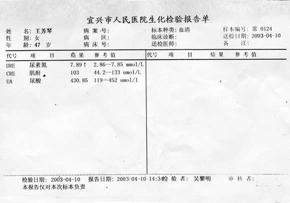 王芳琴治疗前肾功能化验单